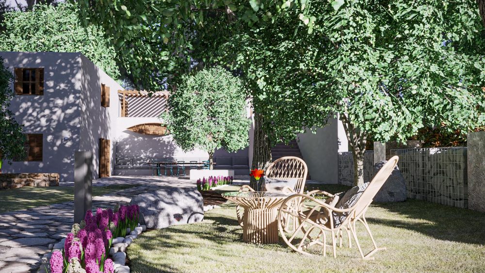 Como puedes ver, el acabado de la vegetación ha mejorado notablemente. El césped se ve más realista, al igual que las flores del lado izquierdo, las sombras y los detalles de la casa del fondo. Pero todo esto parte de una base sólida: un render trabajado con cuidado desde el principio. La ambientación del espacio, los materiales, la iluminación y el encuadre de la escena son fundamentales para que la IA pueda interpretar bien la imagen y mejorarla sin estropearla.