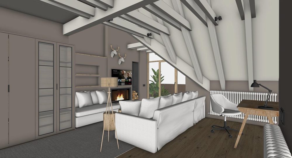 Lo mismo ocurre con los renders de interiores. En las siguientes imágenes utilicé una vista del salón diseñado por el estudio de interiorismo SUENH, con quienes colaboro habitualmente en el modelado 3D de sus proyectos.