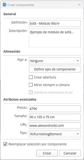 Tipo: Nos permite clasificar los componentes mediante el sistema IFC (Industry Foundation Classes). Dicha clasificación le añadirá parámetros BIM adecuados a su categoría, facilitando su integración con software BIM.